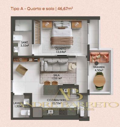 * 1 Quarto (Quarto e Sala) - 46,67m²